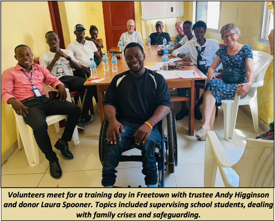 Volunteers meet for a training day in Freetown with trustee Andy Higginson and donor Laura Spooner. Topics included supervising school students, dealing with family crises and safeguarding.