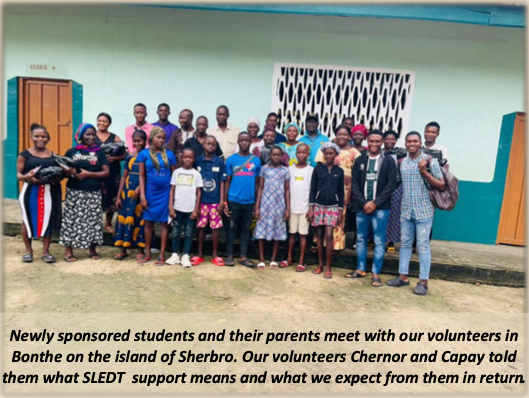 Newly sponsored students and their parents meet with our volunteers in Bonthe on the island of Sherbro. Our volunteers Chernor and Capay told them what SLEDT support means and what we expect from them in return.