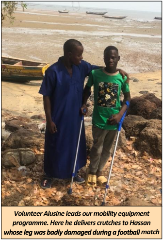 Volunteer Alusine leads our mobility equipment programme. Here he delivers crutches to Hassan whose leg was badly damaged during a football match.