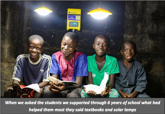 Our students have told us that having a set of textbooks for all their subjects, and a solar light to ensure they can study in the evening, have been vital factors in their success at examinations. Most of our students come from homes without electricity. Even where electricity is connected the supply is very unreliable.